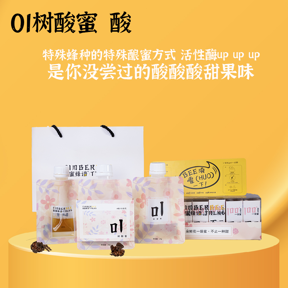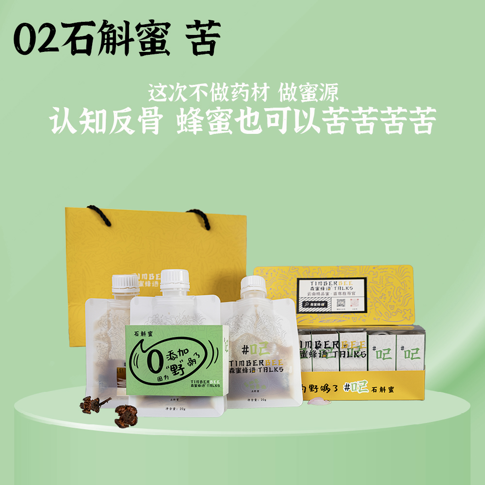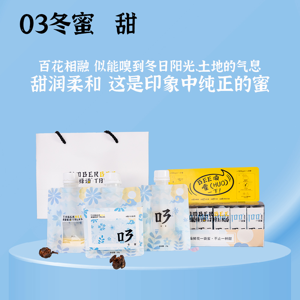 The "Honey Talk" series contains #01 sour honey, 02 Dendrobium honey, 03 winter honey 04 wild chrysanthemum nectar honey, presenting four natural flavors: sweet and sour, bittersweet and moist, moist and floral. The product is packaged in ready-to-drink packaging, providing consumers with the most direct container for tasting honey, which only needs to open the bag and fill it with water, shake until the honey is dissolved, and then drink. Adapt to outdoor, travel, office, social, etc., bring multi-scene use, no dirty hands, no sticky table, no sticky bag, so that every consumer can taste honey elegantly anytime, anywhere.