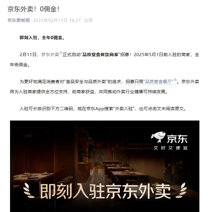 The zero-commission policy for the whole year directly addresses the pain points of food operators. The traditional food delivery platforms typically deduct 15%-25%, and JD.com's move may force the industry to reconstruct profit distribution models, releasing more profit space for small and medium-sized food brands.