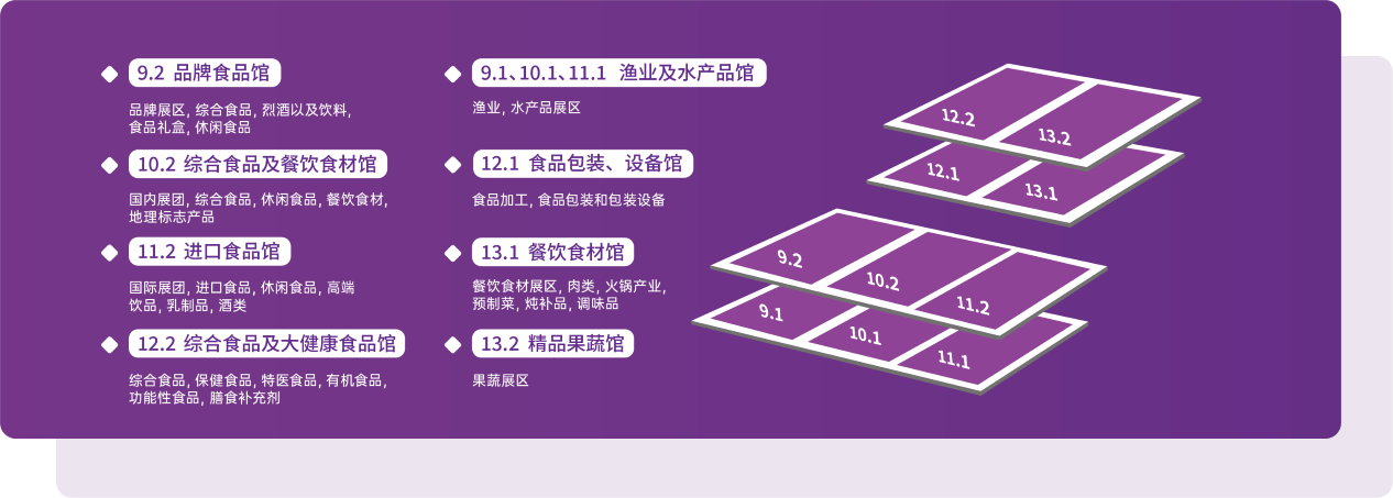 品牌食品館、綜合食品及餐飲食材館、進口食品館、精品果蔬館、大健康食品館、漁業(yè)及水產(chǎn)品館、食品包裝設(shè)備館等10大展館