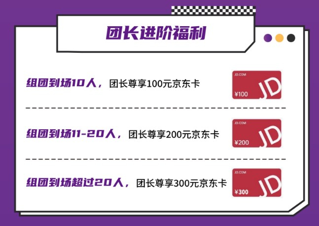 組團(tuán)到場(chǎng)10人,團(tuán)長(zhǎng)尊享100元京東購(gòu)物卡